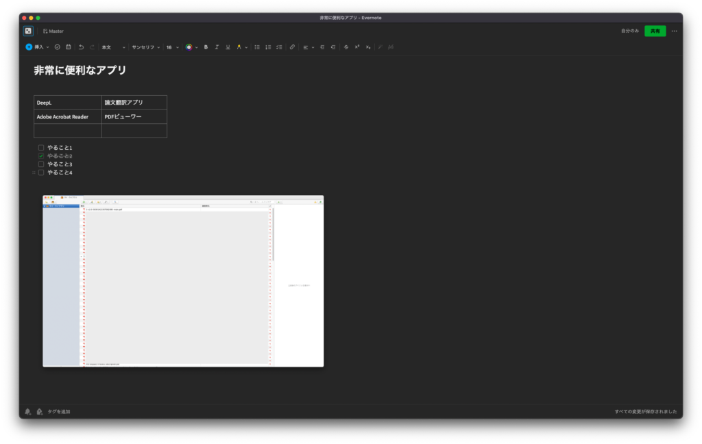 Macにはデフォルトのメモアプリがついていますが,Evernoteでは表やリストなどを簡単に作れるのでおすすめです。