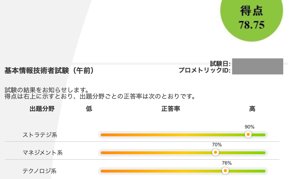 あまり高得点ではないですが,ストラテジ系・マネジメント系・テクノロジ系の各分野で70 %以上の得点率となっているため,ある程度余裕をもって合格できました!